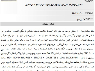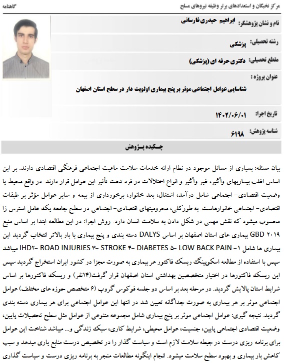 چکیده پژوهش جناب آقای دکتر ابراهیم حیدری فارسانی نخبه وظیفه مرکز تحقیقات SDH با عنوان "شناسایی عوامل اجتماعی موثر بر پنج بیماری اولویت دار در سطح استان" در گاهنامه مرکز نخبگان و استعدادهای برتر وظیفه نیروهای مسلح سال دوم شماره ششم سال 1404 به چاپ رسید.